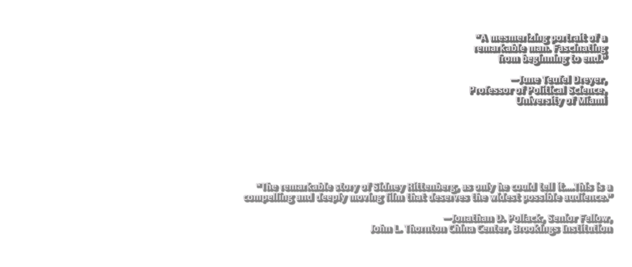 Rittenberg captivates the audience with his exceptional intellect, uncompromising honesty, and engaging personality. Over a five-year period, award-winning former-CBS journalist and China specialist, Irv Drasnin, interviewed Rittenberg to produce a compelling, complex and unique understanding of the 20th century's biggest revolution. From Sid first meeting Mao in the caves of Yan’an, to his becoming famous and powerful during the Cultural Revolution, to his battling insanity in solitary, his journey and his profound insight illuminate a much greater history—a history few Chinese are aware of, let alone many Americans, told by an American who was there.